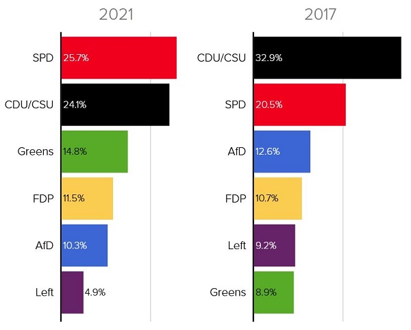 I have not done an in-depth analysis, but my impression is that German democracy is still working, where the largest party vote was for the SPD (Social Democrats) with only 25.7% of the vote. Here’s the vote result in an image: