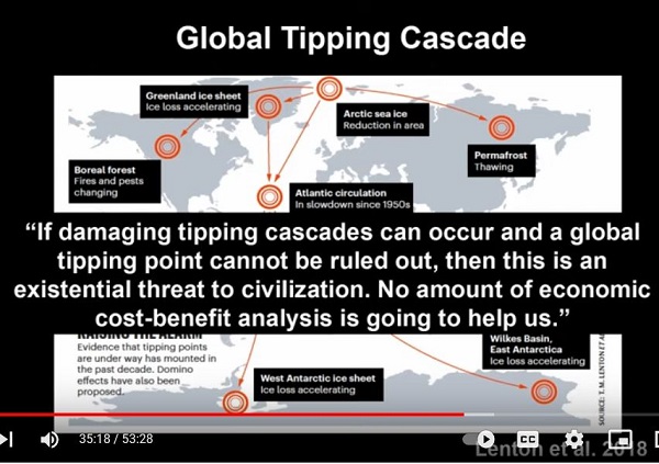 - “If damaging tipping cascades can occur and a global tipping point cannot be ruled out, then this is an existential threat to civilization. No amount of economic cost-benefit analysis is going to help us.”