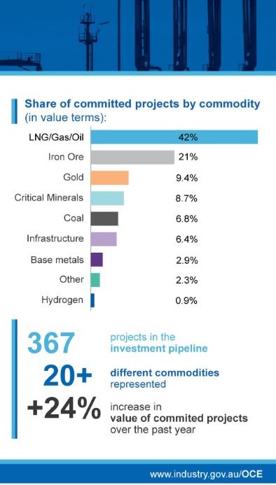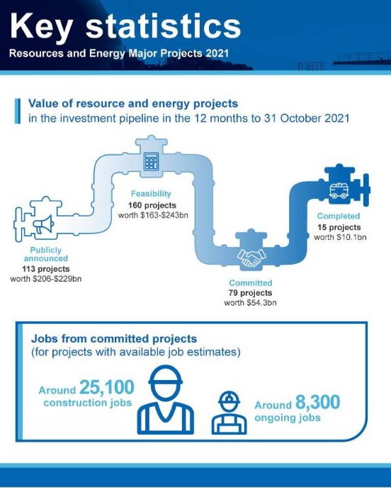 The Australian Government Chief Economist has put out a helpful report Resources and Energy Major Projects 2021 Report (pdf). Here’s the summary graphic, which I’ve divided into two parts to provide legibility. First the value of projects: