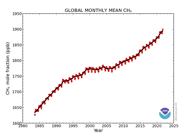 While CO2 has risen about 50% methane has tripled. Here’s how it is trending: