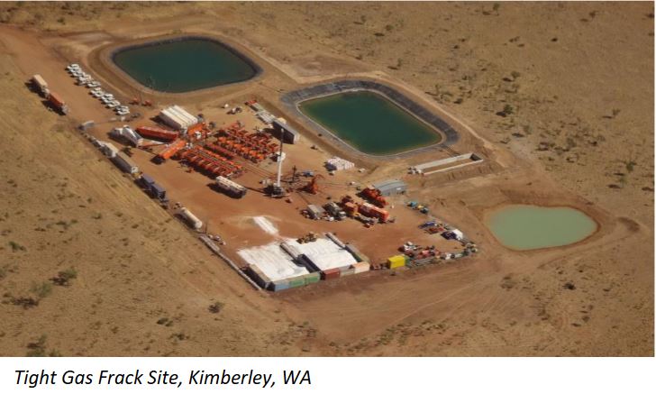 Gas extraction involves drawing out the water (around 30% of what is inserted) yielding wastewater that can contain a range of naturally occurring contaminants from the deep shale layers, heavy metals, naturally occurring radioactive materials, volatile and semi volatile organic compounds and a high concentrations of salts which need to be dealt with. In the Wyoming photo at the bottom towards the right there is a larger hub pad, which may look something like this one in Kimberley, WA: