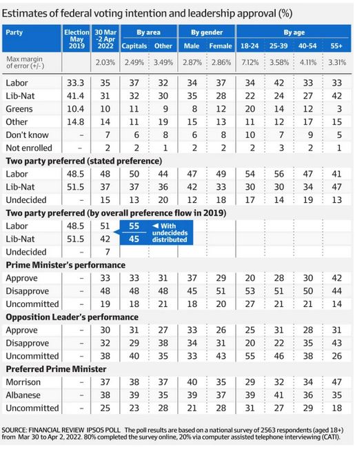The whole poll has a margin or error of 2.03 per cent. No doubt the MOE is greater for each of the demographic components, but the trend shows that Richard Dennis was probably right. Morrison and Frydenberg were shoring up their political base by spraying their money around. The only demographics where they lead Labor are the 55+ and males. They are competitive in the regions.
