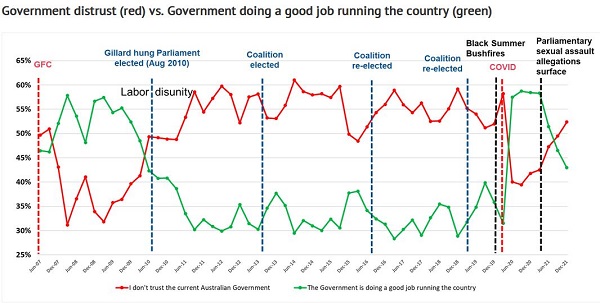 However, the real effect of what the Morrison mobsters have done is restore Australians distrust in government, which goes back to the time when Julia Gillard unseated Kevin Rudd, with a brief interlude of trust after the COVID response, only to be broken by parliamentary sex scandals and COVID vaccination delays from about the middle of last year.