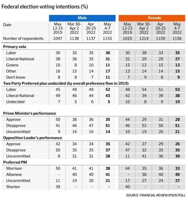 The AFR Ipsos poll of May 4-7 is calculated differently but shows Labor with a TPP lead of 52 per cent to 40 per cent for the Coalition, with 8 per cent undecided. They also do a gender divide, which shows women have given up on Morrison:
