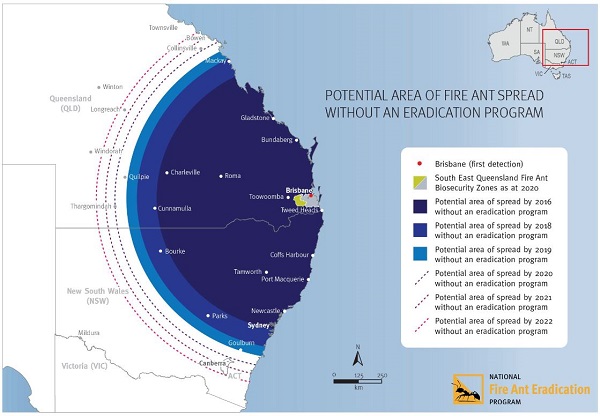 As the Queensland minister said on 25 July the New response plan has fire ants surrounded. If nothing had been done since 2001, natural spread alone would have seen the fire ant infesting “approximately 100 million hectares in an arc of country from Bowen in the north, west to Longreach and south to Canberra.”