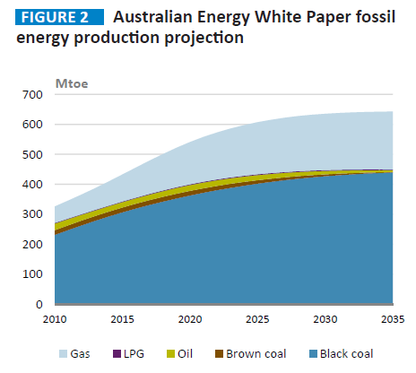 Tristan Edis at Climate Spectator has taken a look at the folly of official of the official Bureau of Resource and Energy Economics forecasts on fossil fuel energy production. Edis looks at the Australian Energy White Paper, a paper from BZE (Beyond Zero Emissions) entitled A fossil economy in a changing world and the IEA World Energy Outlook 2014. I recommend reading Edis’s article in full but two graphs tell much of the story. First the Australian Energy White Paper fossil energy production projection: