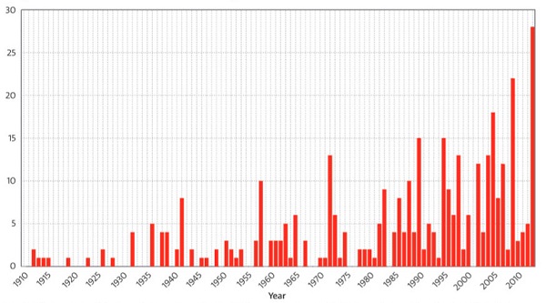 The following graph shows the number of days each year where the Australian area-averaged daily mean temperature was above the 99th percentile for the period 1910-2013: