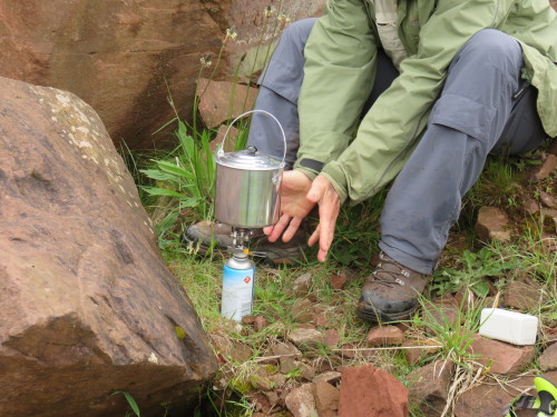 By now it was raining and we each had our particular array of gear to attempt to keep dry. In my case it included a Gore-Tex and a poncho (no water-proof trousers at this stage). This had the advantage of keeping both my pack (back) and SLR camera bag (front) safe from the weather. Everyone else I saw on the walk preferred to use a rain-proof jacket and a pack-cover. In fact, pack covers are not very effective if the weather turns really nasty. And rain jackets can be far from water-proof as well. On the other hand, I was very confident that no water was going to penetrate my plastic poncho! So even though I looked a sight, I was very happy with my choice of gear!