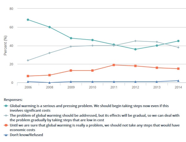 The number of Australians now saying global warming is a “serious and pressing problem” and that “we should begin taking steps now even if this involves significant costs” is now 45%.