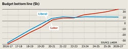 The basic story of Labor’s costings could be told in one graph, but because of their media incompetence I couldn’t find a square-on shot of it on the net on Sunday. Here it is from the AFR: