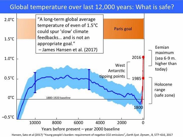 To set this up, the following is a graph of the temperature during the Holocene Era comes from a 2017 James Hansen publication, with explanatory enhancements by David Spratt: