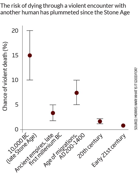 The graphic shows an increase in violent deaths during what Morris terms the ‘age of migrations’, from AD200-1400. This was a time when Fukuyama would say social/political organisation in Europe had moved beyond the tribal, but had not yet achieved the form of the modern state. It was not a time when the state competently and fairly extracted taxes from all and applied them consistently for the general good. Tom Holland in his book Millennium describes how rulers saw it as their mission to Christianise the heathen but they did this by plundering and bringing home the loot. There was a zero sum attitude to economic growth. You accrued great wealth by taking it from other people.